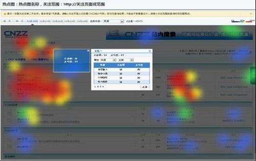 CNZZ統(tǒng)計(jì)工具在設(shè)計(jì)及研發(fā)上更加注重用戶體驗(yàn)與實(shí)用性,用戶只需將關(guān)注的受訪頁面鏈接添加到“熱點(diǎn)圖”功能中,并保證該頁面已成功放置CNZZ“站長統(tǒng)計(jì)”代碼,第二天即可查看“熱點(diǎn)圖”相關(guān)數(shù)據(jù)情況。在申請開通“熱點(diǎn)圖”功能后,用戶可同時關(guān)注十個熱點(diǎn)頁面。打開某一頁面熱點(diǎn)圖,興趣點(diǎn)展現(xiàn)一目了然,圖中紅色區(qū)域表示點(diǎn)擊熱度最高,橙色、黃色、綠色次之,而藍(lán)色區(qū)域則表示點(diǎn)擊熱度最低。
